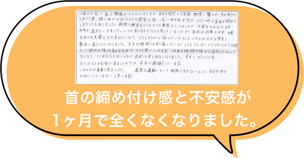 1回目の施術の後から症状はほとんどなくなり、1ヵ月もたたないうちに症状は全く出なくなりました。本当にびっくりです。