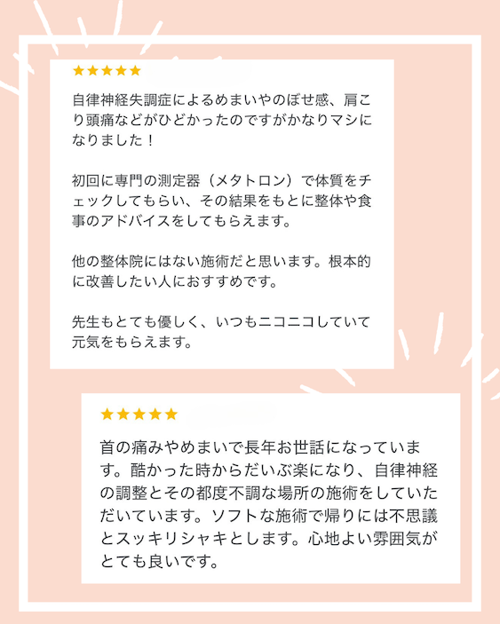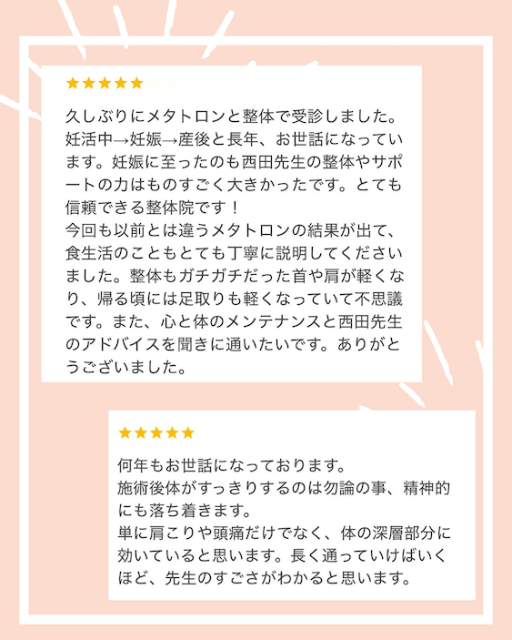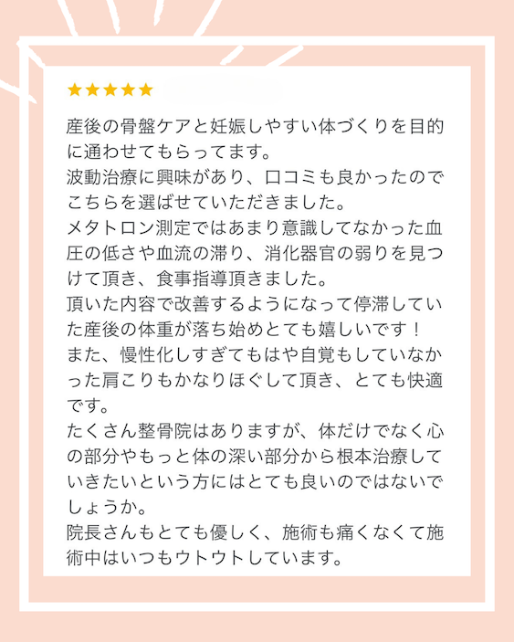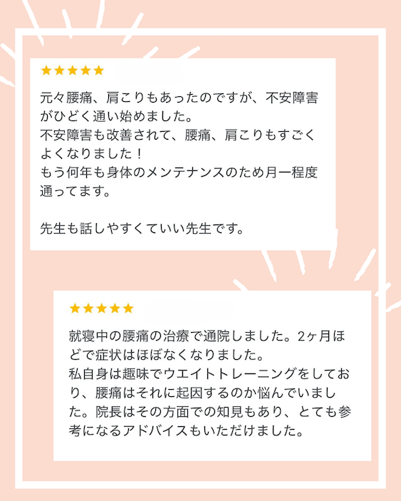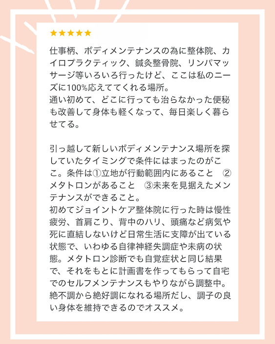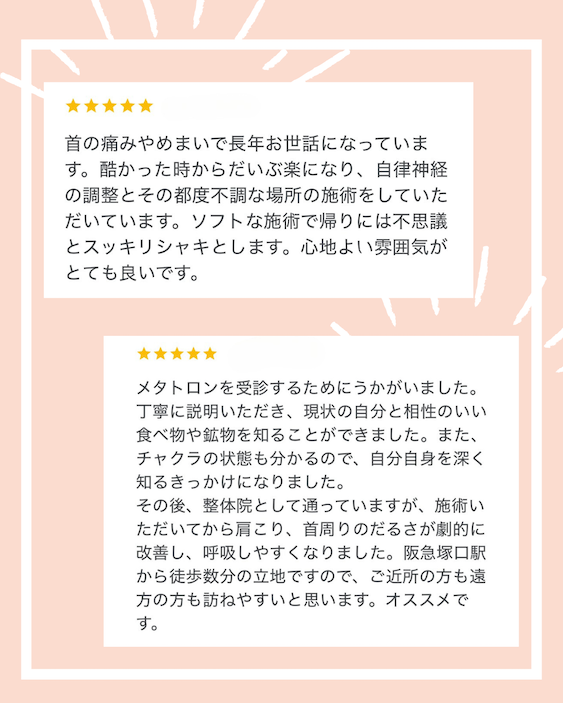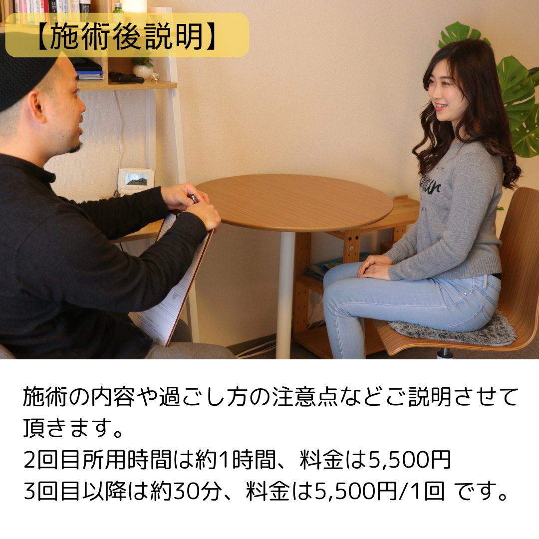整体ははじめてだったのですが、先生の丁寧なカウンセリングと説明に安心して施術を受ける事ができました。