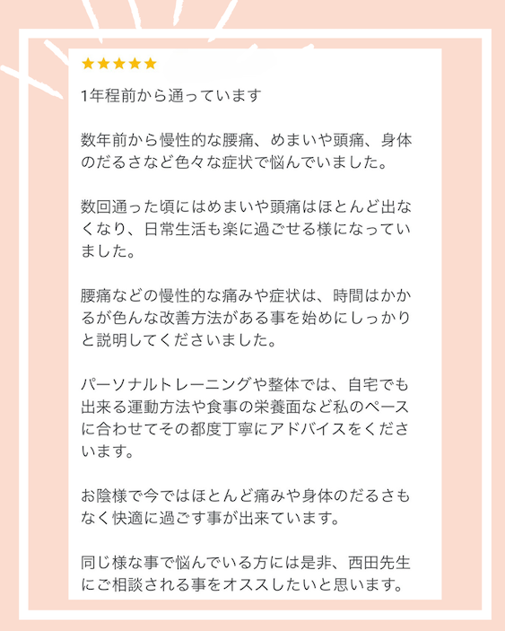 いつか良くなるだろうと思っていましたが、症状は改善されず、日常生活にも支障をきたすようになり、どうしようかと悩んでいたところ、こちらのHPを拝見し、整体に通うことになりました。