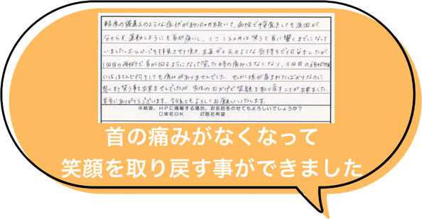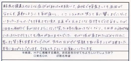 ホームページを拝見させて頂き、正直ダメ元のような気持ちで伺いましたが、1回目の施術で首が回るようになって笑った時の痛みはなくなり、
